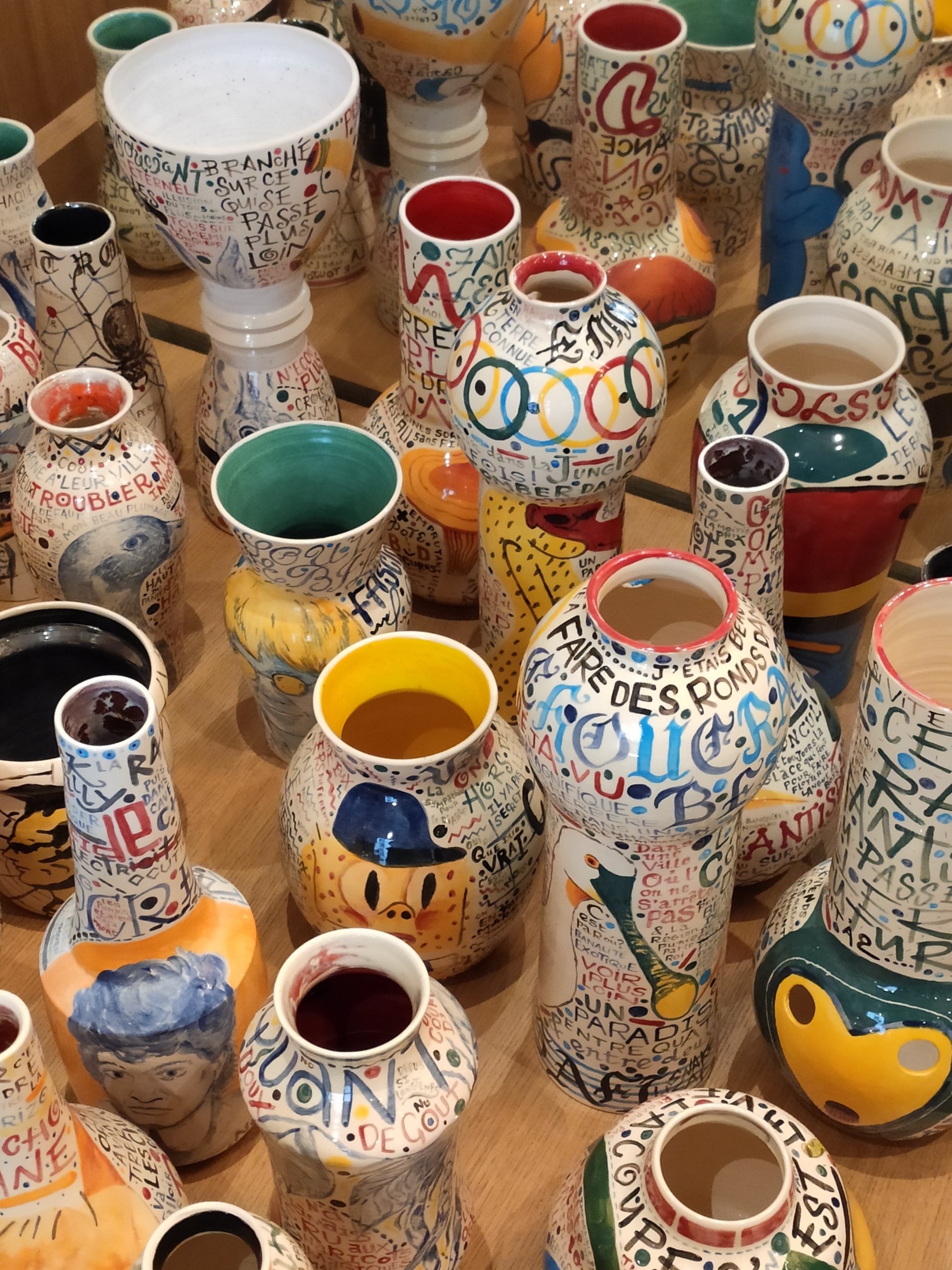 PLEIN POTS témoigne des déambulations quotidiennes et des élucubrations nocturnes de Mon Colonel & Spit. Les mots débordent, saturent l’espace, confessent ce que la pensée obligerait à taire. A l’image des “inscriptions sur les bancs d’écoles, des murs de prisons, des portes de WC ou des notes gribouillées en bas d’un carnet”, les oeuvres forment des tranches de vie cryptiques, dont seuls les artistes ont la solution complète